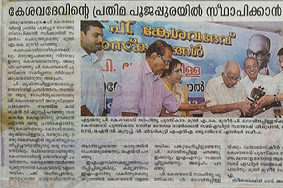 The 8th Kesavadev Awards were presented at an auspicious function held at Symphony Hall, Mascot Hotel on 8th Aug 2012 by Hon. Minister for Social Welfare Dr. M.K.Muneer. The annual Kesavadev Awards are given in proud memory of P.Kesavadev, the renowned novelist and social reformer of Kerala. Kesavadev Literary Award was presented to Sri.P.Govinda Pillai, veteran Communist Party of India leader and ideologue. The Diabscreen Kerala Kesavadev Award was presented to Mr. Santhosh Sisupal, Editor, Manorama ‘Arogyam’ for his health related article ‘Ee Verpaadukal Parayunnath’. Dr. Muneer announced the Government initiative to raise a statue of P.Kesavadev at Poojapura which was well received by the elated crowd. Ms. Seethalekshmi Dev chaired the function while Dr. Jothydev Kesavadev addressed the audience. The welcome speech by Dr.George Onakkoor was followed by Kesavadev commemoration speech by Jnanapeed Award laureate Padmavibhooshan Prof. O.N.V .Kurup. Felicitations were given by Dr. Paul Sebastian (Director, Regional cancer Centre) and Shri, V.Sivankutty MLA. Votes of Thanks were given by Ms. Sunitha Jothydev. Ms. Surabhi compared the function and Mr. Vinu Krishnan coordinated the event.