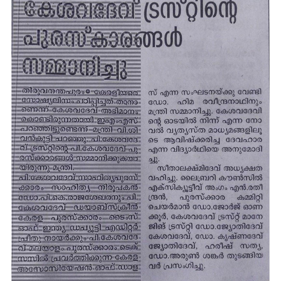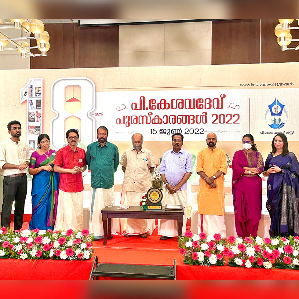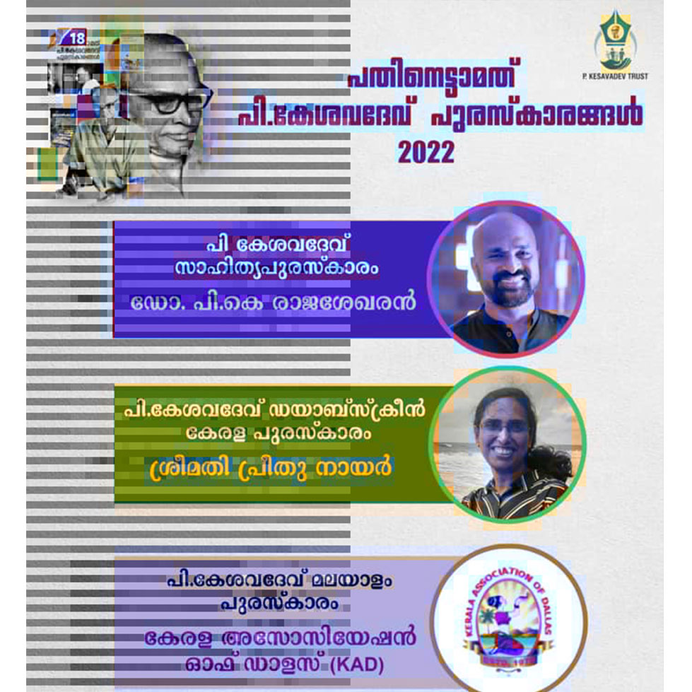 The 18th P. Kesavadev Awards have been presented to renowned literary critic, researcher and journalist Dr.P.K. Rajasekharan, Times of India Deputy Editor, Ms. Preetu Nair, and Kerala Association of Dallas (KAD). Shri.V. Sivankutty, Minister of Education and Labour, presented the awards, Literary Award to Dr.P.K. Rajasekharan, Diabscreen Kerala award to Ms. Preetu Nair and Malayalam award to Kerala Association of Dallas (KAD), at the award ceremony in Hotel Hilton Garden Inn, Trivandrum, Kerala, organized by the P. Kesavadev Trust, which instituted the awards in the name of the yesteryear writer-activist to acknowledge seminal contributions in the field of literature, public health education and for the organization that promotes Malayalam language outside Kerala. Dr.Hima Raveendranath received the award on behalf of the Association. The Trust also extended an award and cash prize to Baby. Devahara, who presented the story ‘Odayil Ninnu’ by P.Kesavadev in a different creative way. Smt.Seethalekshmi Dev, chairperson of P. Kesavadev Trust, chaired the event. Mr.Rathindarn, Library Council Member of Kerala, in his keynote address highlighted the values of humanity upheld by P.Kesavadev in his writings. Dr.George Onakoor, Dr.Jothydev Kesavadev and Mr.Harish Sathya spoke at the event. Krishnadev Jothydev welcomed the gathering and Dr. Arun Shankar concluded the program with a vote of thanks.