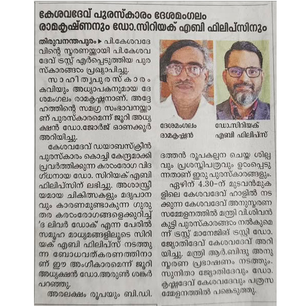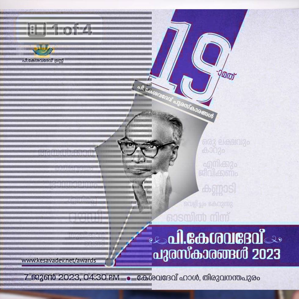 The 19th P.Kesavadev Awards were presented on the 7th of June 2023, at the P.Kesavadev Hall. V Sivankutty, Minister of Education and Labour, presented the P.Kesavadev literary award to Dr.Desamangalam Ramakrishnan, for his contributions towards literature, and the P.Kesavadev Diabscreen award to Dr.Cyriac Abby Philips for his contributions towards healthcare. Minister of Higher Education Smt.R. Bindu delivered the Kesavadev memorial speech. Trust chairperson, Smt.Seethalakshmidev was the chairperson of the program. Minister V Sivankutty, T.N Krishnachandran, Dr.George Onakkoor, Vijayakrishnan, Dr.Desamangalam Ramakrishnan, and Dr.Syriac Abby Philips spoke during the event. Smt.Sunitha Jothydev gave the vote of thanks.